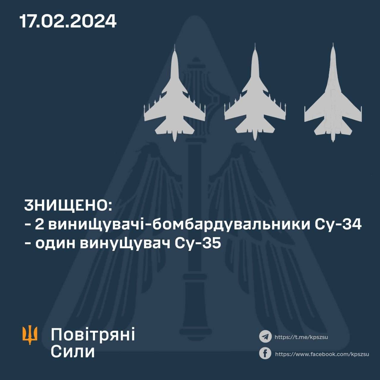 به گزارش خبرگزاری ست نیوز، در اوکراین، نیروی هوایی این کشور اعلام کرده پدافند آنها ۳ فروند جنگنده روسی شامل ۱ فروند Su-۳۵ و دو فروند Su-۳۴ را ساقط کرده است.