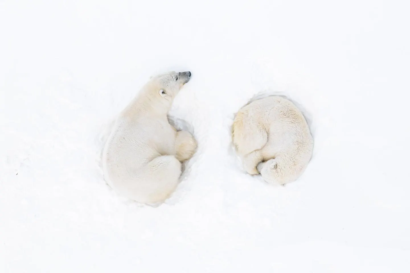 عاشقانه قطبی، عکس زیبای فلوریان لدوکس از یک زوج خرس قطبی است که یک خرس قطبی نر و ماده را نشان میدهد که در کنار هم دراز کشیدهاند.